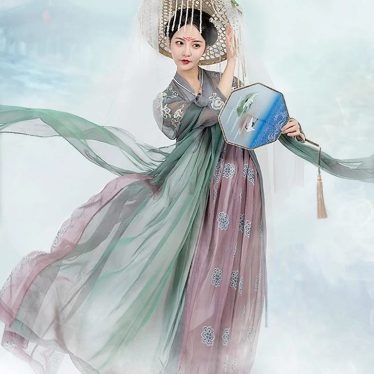 Chinese clothing worn by the Han Chinese. The qun used in the qixiong ruqun is generally tied above the bust level. The qixiong ruqun is a unique style of ruqun (Chinese: 襦裙), which is characterized with a high waistline qun, Chinese skirt. Sui dynasty, Tang dynasty and Five Dynasties and Ten Kingdoms period. The style was also revived in the early and middle Ming dynasty. Since the Han dynasty and Jin (Chinese state), the waist of the skirt has typically been tied on the waist, while in the Sui dynasty, Tang dynasty and Five Dynasties, the waistband of the dress was much higher, many of which were usually above the chest or under the armpit. Some records of clothing history refer to it as the high-waist ruqun. Later, it was renamed to qixiong ruqun, according to the current inspection and certification by people. Tang dynasty’s high-waisted skirt with a short ru (襦) or from a later revival of the Tang dynasty fashion. The qixiong ruqun was a typical form of women hanfu in the Tang dynasty. Qixiong ruqun was also adopted by the Khitan women and continued to be worn in Liao dynasty even after the fall of the Tang dynasty. It is distinguished from the gaoyao ruqun (高腰襦裙; high-waisted ruqun), which is attached below the chest and above the waist. The qixiong ruqun was named after its location on its wearer’s body. In ancient times, ruqun dresses for women were not very high waisted, but ruqun dresses with very high waists appeared from the Northern and Southern dynasties to the Sui dynasty, Tang dynasty and Five Dynasties. Qiyao ruqun (齐腰襦裙; waist ruqun) is tied at the waist while qixiong ruqun is tied under the armpit. Some clothing history records call it the high-waisted ruqun, and it was later changed to qixiong ruqun according to the current people’s examination and certification of it. Song dynasty, when, upon Neo-Confucianism’s rise, the fashion of Tang dynasty faded. Prior to the Putong period (520-527 AD) of the Liang dynasty, the waistline of the women’s ruqun were located at the waist. During the Southern dynasties, the women’s ruqun evolved and was tied higher. Their ruqun belt line became higher and the skirt was attached at the chest level. The qixiong ruqun first appeared in the Northern and Southern dynasties. Their ru (襦) had open necklines. The ru (襦) with open neckline started since the Datong period (527-529 AD); prior to that, the collars of the women’s ru were designed to be tight-fitting from the Southern Qi dynasty (479-502 AD) to the Liang dynasty. During the Sui dynasty and Tang dynasty, blouses were generally worn as short ru (襦); banbi (半臂) (i.e. short-sleeved upper garment)and pibo (an accessory which looked like a long shawl) both constituted an integral part of ruqun at the time. In this period, the ru (襦) with short sleeves became a popular trend for the time. During the Sui dynasty, the dress code of the Han dynasty was revised and a clothing system with the characteristic of the Han Chinese was established. Sui dynasty female attendants wearing qixiong ruqun. Musicians wearing qixiong ruqun, Sui dynasty figurines. The Tang dynasty was the heyday of economic, cultural, artistic and diplomatic history in Chinese history. Tang dynasty people wore short sleeved ru (襦) and a floor-length skirt, but after the heyday of the Tang dynasty, the aristocratic costumes turned to become large and complex. Qixiong ruqun is a representative costume of the Tang dynasty and was very popular among Tang dynasty ladies. It also created the characteristics of this dynasty’s freedom, gracefulness, and colourful clothing. In the Tang dynasty, qixiong ruqun was typically worn long a wide-sleeved blouse, long-full skirt, and long silk scarves with painted motifs as part of the set of attire. During the High Tang period, women were less constrained by feudal ideas and wore clothing which would allowed the exposure of cleavage. The traditional form of ruqun worn in the previous dynasties was maintained in the Tang dynasty, but the “V” collar of the ru was deepened to the point that the cleavage was exposed. It was typically worn by noble ladies or female attendants who served in high status households, such as in important families and even the royal family. When the skirt (qun, 裙), ru (襦), and pibo (披帛) are paired together, the woman’s grace and temperament in the Tang dynasty were fully presented, showing a poetic beauty and rhythm. The skirt waistband being tied at the chest or at the armpits allowed the neck and chest regions to be exposed. The qixiong ruqun with shoulder straps appeared to have been rarely used in China during the Tang dynasty. The styles of qixiong ruqun with shoulder straps are often found in pottery figurines or paintings unearthed before the Tang dynasty. Until the development of the Kaiyuan (开元) period of the Tang dynasty, when the style became fixed under the armpit. The ru (襦) neckline varied, and the most popular one was daxiushan (大袖衫), which was full of the spirit of the people’s ideological emancipation during the Tang dynasty. There were variety of skirts during the Tang dynasty. The style of the skirt is stitched with four fabrics, the upper part is narrow, the lower part is loose, and the hem hangs down to the ground. At the beginning of the Tang dynasty, the skirts were narrow but became looser in the High Tang period. Silk is used at the waist of the skirt, and laces are sewn at both ends. Skirt (qun; 裙) fabrics were mainly silk fabrics. The more expensive the materials, the better. Striped skirt (jianqun): High-waisted striped skirts became mainstream since the Northern dynasties and lasted until the Sui-Tang dynasties. Pomegranate skirt (Shiliuqun: 石榴裙): the colour pomegranate red was famous for the longest time. Zhou dynasty’s bell skirt: A skirt which was decorated with twelve bells at the four corners of the dress. The design of the waist of the skirt wa